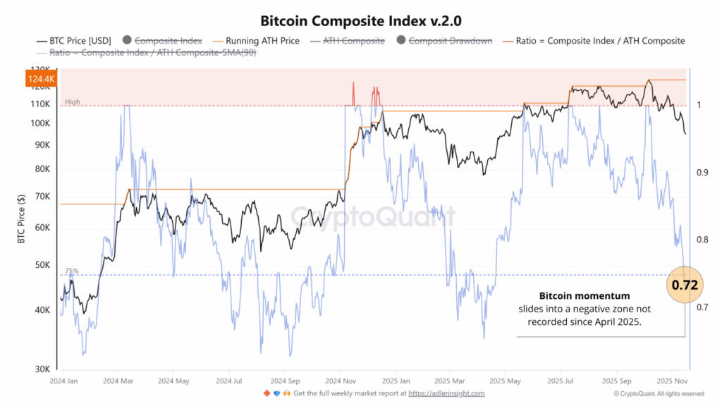With on-chain metrics tilting decisively into the “Correction” zone not seen since April 2025, Bitcoin markets find themselves at a crossroads. The Composite Momentum Index, standing at a ratio near 0.72, signals mounting pessimism among market participants—a psychological threshold that historically precedes profit-taking by short-term holders and triggers accelerated price corrections.