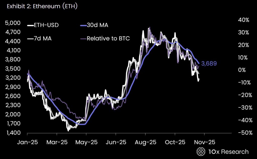 At current levels near $3,182, Ethereum finds itself in precarious territory. The asset has surrendered ground to both its 7-day and 30-day moving averages, confirming a structural shift toward bearish sentiment that intensified throughout early November. The one-week performance shows a decline of 6.6%, with the price unable to reclaim short-term trendlines at any point during the sell-off.