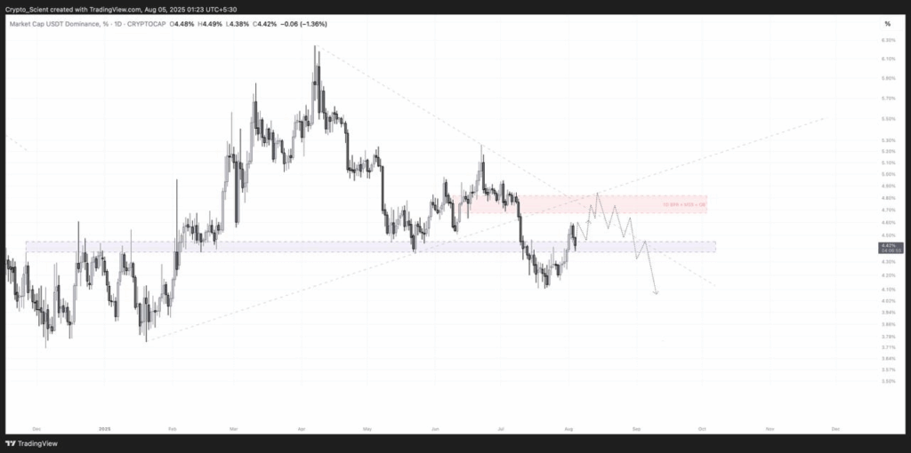 According to market analysis, (USDT.D) has recently surpassed a key support zone that has historically underpinned Bitcoin’s strength. While Bitcoin tends to perform robustly when (USDT.D) remains below this threshold, its current trading at approximately 4,42% signifies a notable departure. This technical breakout suggests capital is now moving away from risk-on positions, prompting concern among Bitcoin enthusiasts.