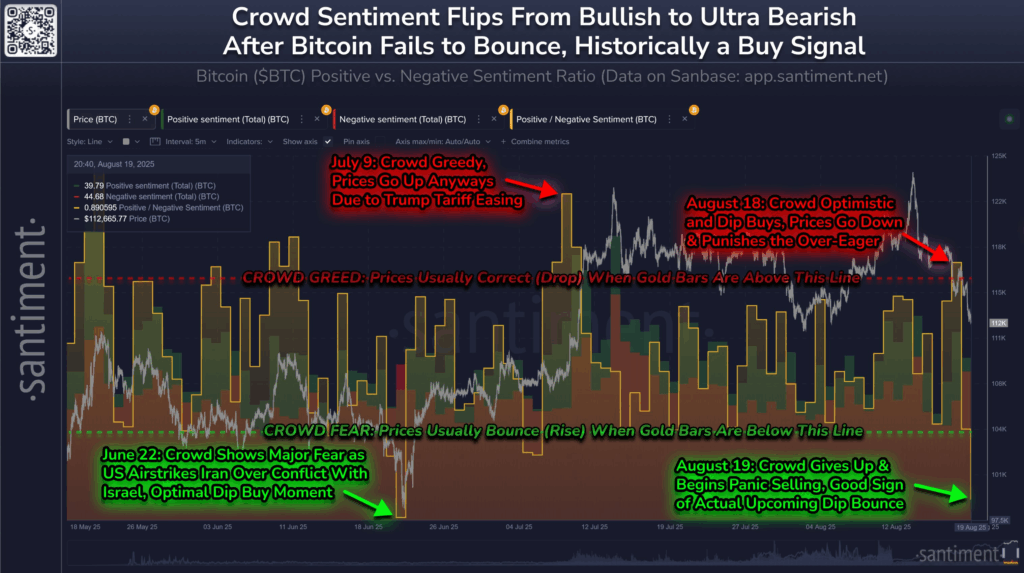 😨 Retail traders have done a complete 180 after Bitcoin has failed to rally and dipped below $113K. The past 24 hours have marked the most bearish sentiment seen on social media since the June 22nd fears of war caused a cascade of panic sells.