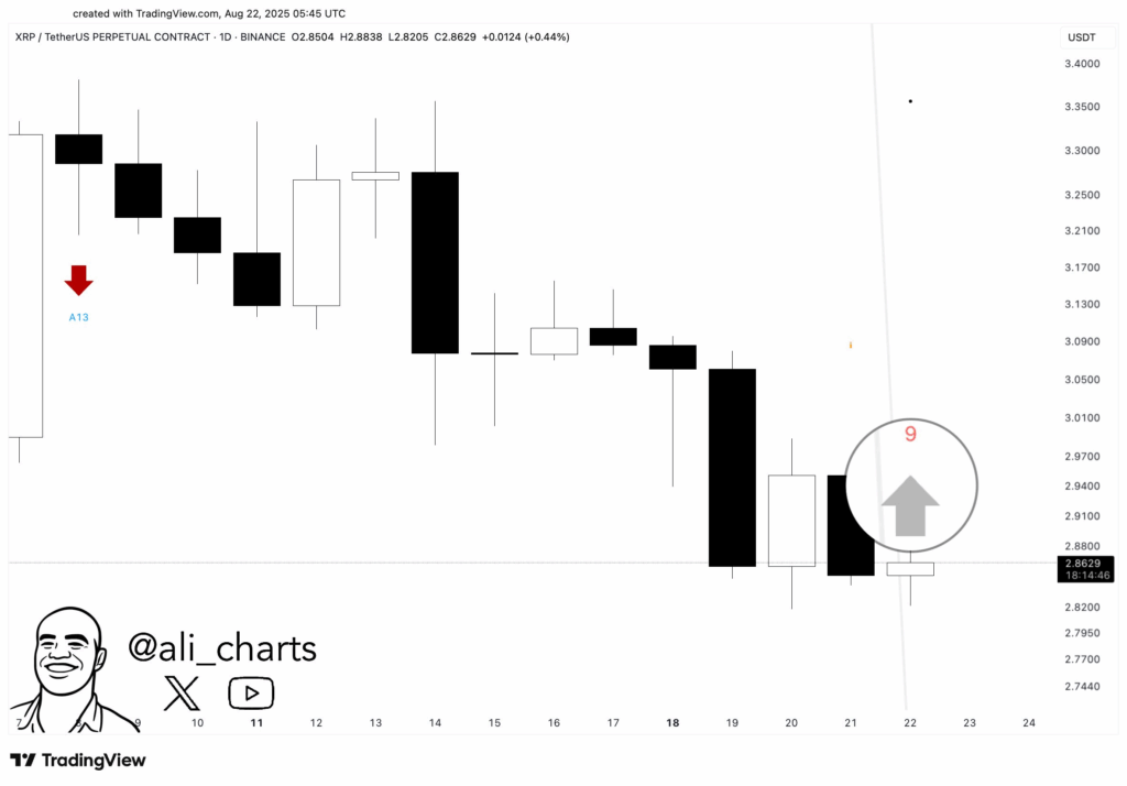 Now, the tables have turned. On August 22nd, after nine consecutive daily candles closed lower than the previous one, the TD Sequential printed a ‘9’ buy signal. In technical analysis, such a sequence often signifies trend exhaustion, suggesting that selling pressure is waning and buyers may be poised to retake control. At the time of the signal, XRP was trading at $2,8629, sparking immediate interest in a potential relief rally.