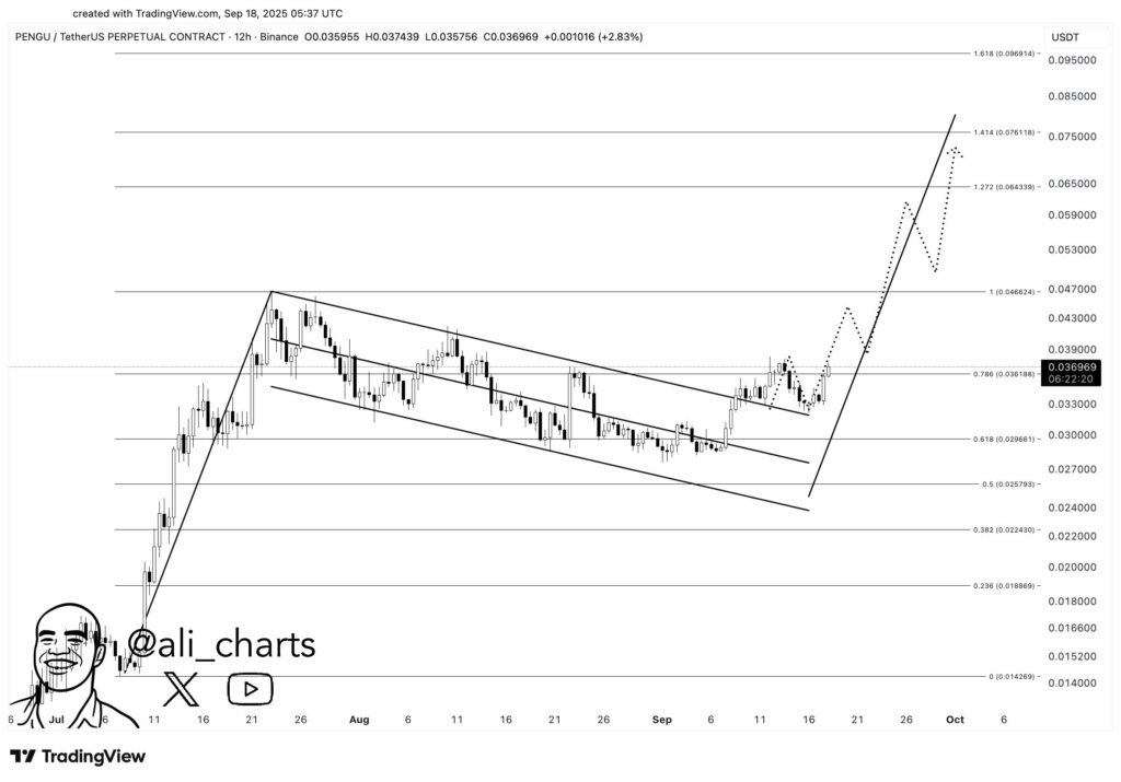 As of publication, PENGU is trading near $0.037, posting a double-digit gain over the past 24 hours alongside a remarkable $528 million in trading volume. This resurgence follows confirmation of a critical support level at $0.032, with Fibonacci projections now targeting $0.047, $0.064, and $0.076 in the near term. Market analysts, including Ali Martinez and Bitcoinsensus, point to a textbook “bullish flag” continuation pattern—historically a precursor to accelerated price expansions. If the trend sustains, price action could plausibly extend toward the $0.09 threshold.