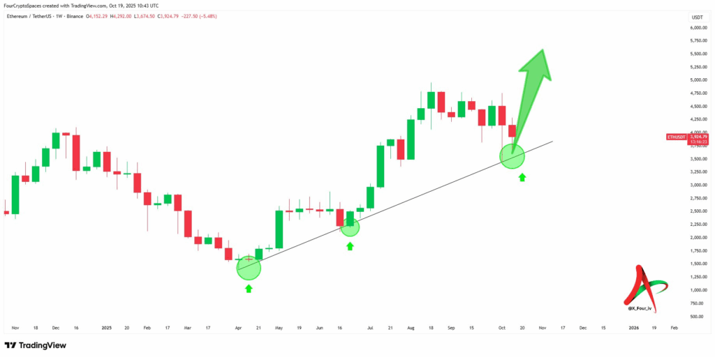 Seasoned traders compare Ethereum’s current technical structure to previous breakout phases, underscoring its strength among major assets on higher timeframes. Each touch of the uptrend line has triggered substantial expansion, and a decisive bullish candle on the weekly chart would validate further upside.