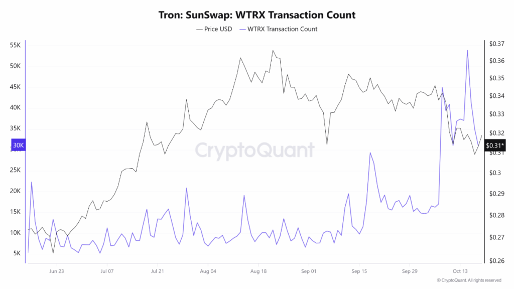 Tron DeFi ecosystem has showcased a rare and telling divergence: WTRX transaction counts on its flagship DEX, SunSwap, have reached an unprecedented all-time high, clocking in at 54,000 daily transactions at the peak, even as TRX’s price retreated. This surge, recorded on October 15, highlights how user engagement and DeFi activity on Tron are defying conventional market sentiment, amplifying platform resilience in the face of price volatility.