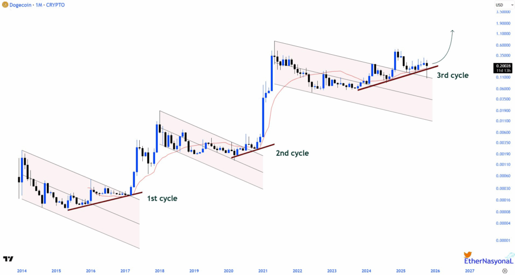 Looking deeper, Dogecoin’s price behavior traces a reliable cycle of accumulation followed by breakout and consolidation. This structure echoes the asset’s past market cycles: the 2014-2017 period saw a languid drift before a burst upward, while 2018-2021 culminated in the exuberant rallies that characterized the last bull run. The current cycle, stretching from 2022 through today, tracks a familiar downtrending channel, methodically rising along a long-term support. Historically, each major move has begun when DOGE closed decisively above structural resistance—a milestone now within reach.