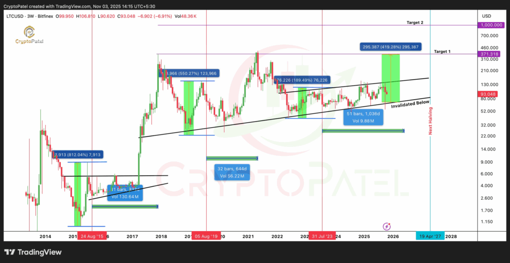 Technical analysts, referencing both historical data and sophisticated charting methodologies, are lining up behind ambitious projections. In prominent discussions on X, multiple strategists point to Litecoin’s extended period of subdued trading as the precursor to a breakout, forecasting that LTC could surge between $500 and $2,000 in the next altcoin season—a potential tenfold increase from current valuations.